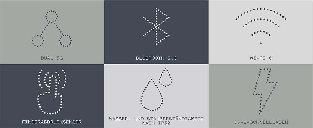 Das Nothing Phone 1 unterstützt Dual-SIM (Nano-SIM) inklusive umfangreicher Mobilfunkbänder für GSM, UMTS, LTE-Advanced sowie Dualmodus-Gigabit-5G (NSA & SA). Damit sind Sie weltweit bestens vernetzt – ob im Büro oder unterwegs. WLAN nach Standard Wi-Fi 6 (802.11ax) sowie Bluetooth 5.3 sorgen für schnelle und stabile Verbindungen. GPS wird über diverse Systeme wie GLONASS, GALILEO oder QZSS präzise unterstützt.