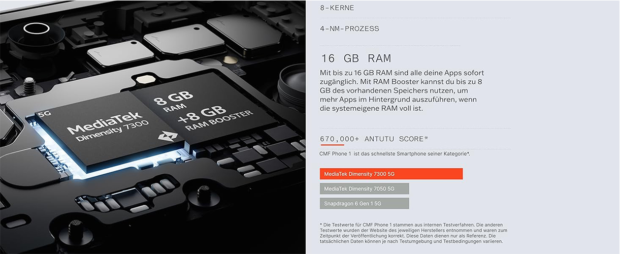 Ein Smartphone, das modernes Design mit leistungsstarker Technik vereint. Angetrieben vom MediaTek Dimensity 7300 5G Prozessor auf Basis der fortschrittlichen 4-nm-Technologie, bietet das Gerät mit bis zu 2,5 GHz Taktrate und acht Kernen eine effiziente und flüssige Performance für alle Anwendungen des Alltags.