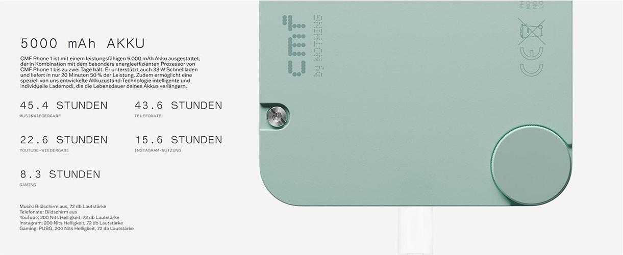 Der langlebige Akku mit einer Kapazität von 5000 mAh ermöglicht ausdauernde Nutzung ohne ständiges Nachladen; dank einer Ladeleistung von bis zu 33 Watt ist der Akku schnell wieder einsatzbereit. Zusätzlich verfügt das Gerät über eine IP52-Zertifizierung, die Schutz gegen Staub und Spritzwasser gewährleistet.